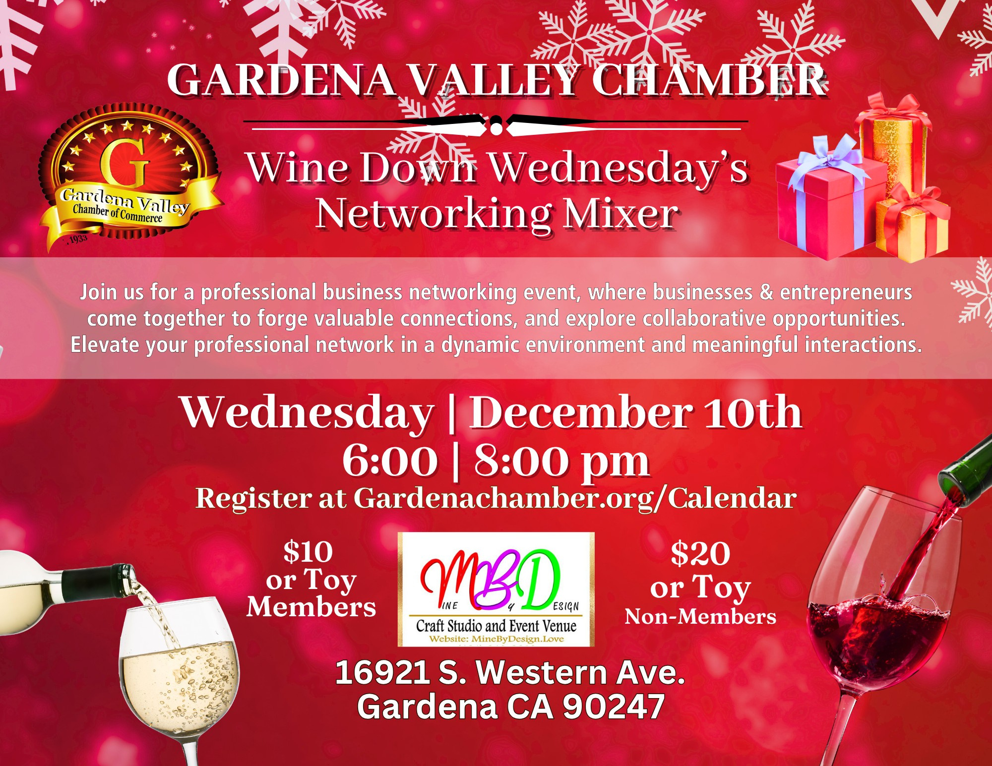 Join Gardena Chamber's WINE Down Wednesday vibrant monthly networking event that brings together local professionals, business owners, and community members for an evening of relaxed connection and collaboration. Held in a welcoming, casual atmosphere, attendees enjoy curated wine and light refreshments, and engaging conversations that foster new relationships and strengthen community ties. If you're looking to grow your network, showcase your business, or simply unwind with like-minded individuals, WINE Down Wednesday offers the perfect blend of business and pleasure in the heart of Gardena