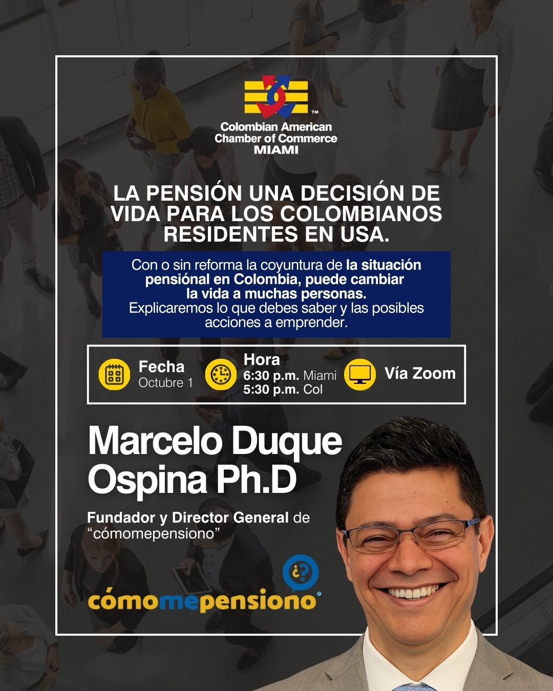 Este 1 de octubre, conéctate a nuestra charla con Marcelo Duque Ospina Ph.D, fundador de cómomepensiono, y descubre las claves para tomar decisiones inteligentes sobre tu pensión desde EE. UU.