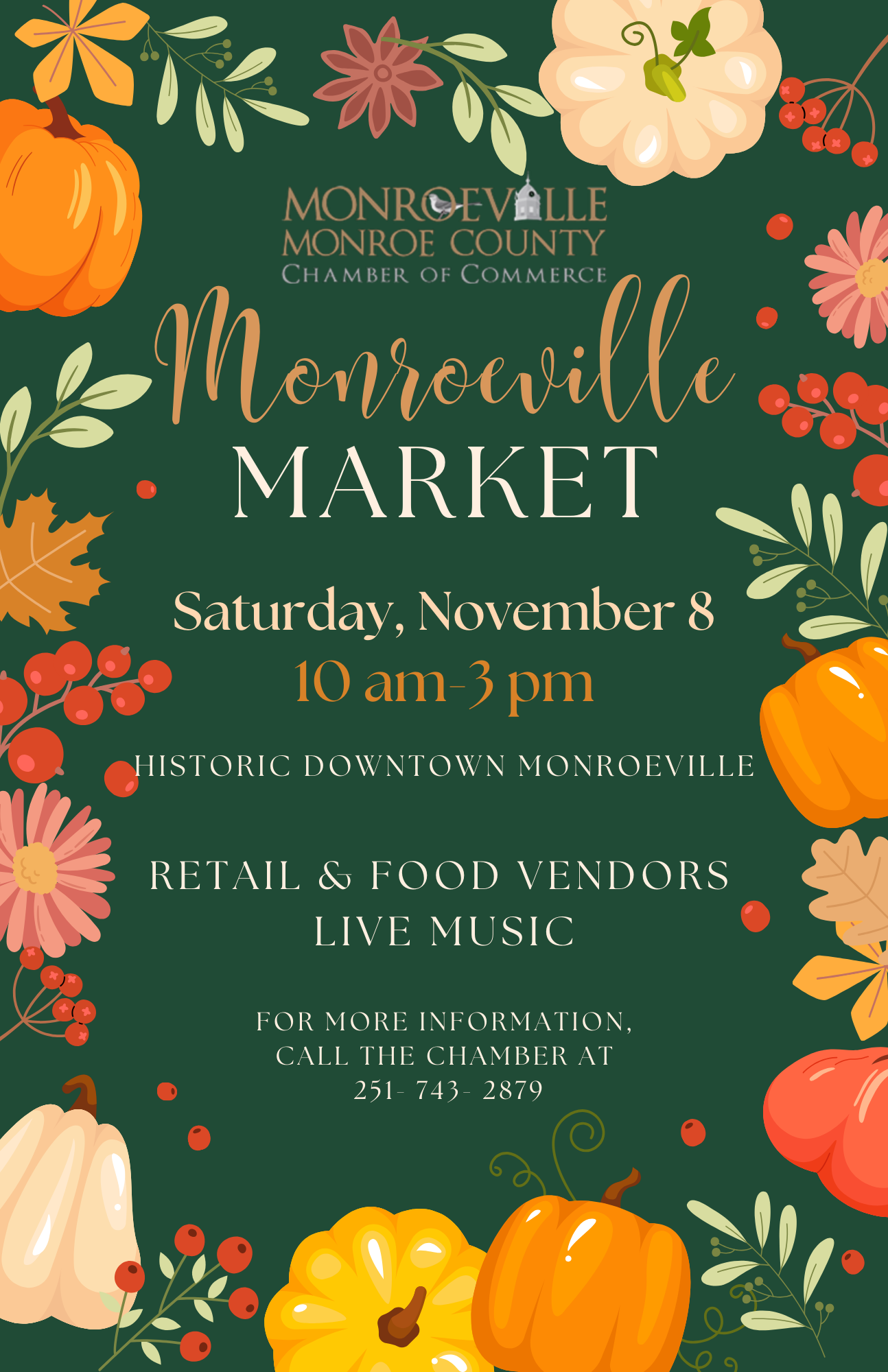 The Monroeville Market will be held on the square in downtown Monroeville from 10 am until 3 pm on Saturday, November 8, 2025. Live music, food and retail vendors will available. Many of the downtown businesses will have extended Saturday hours and specials going on for the Market. Vendors must provide their own tables, tents, and chairs. No electricity will be provided. This is a rain or shine event. No refunds for cancellations. Booth space assignments are based on items sold and receipt of application and fees. Booth prices: 10x10 booth space: $40 for Chamber members and $75 for non-members. Double booth space: $75 for Chamber members and $150 for non-members. Kid's corner booths (ages 7-18): $20. Food vendors booth spaces: $40 for Chamber members and $75 for non-members. Questions? Call the Chamber at 251-743-2879.