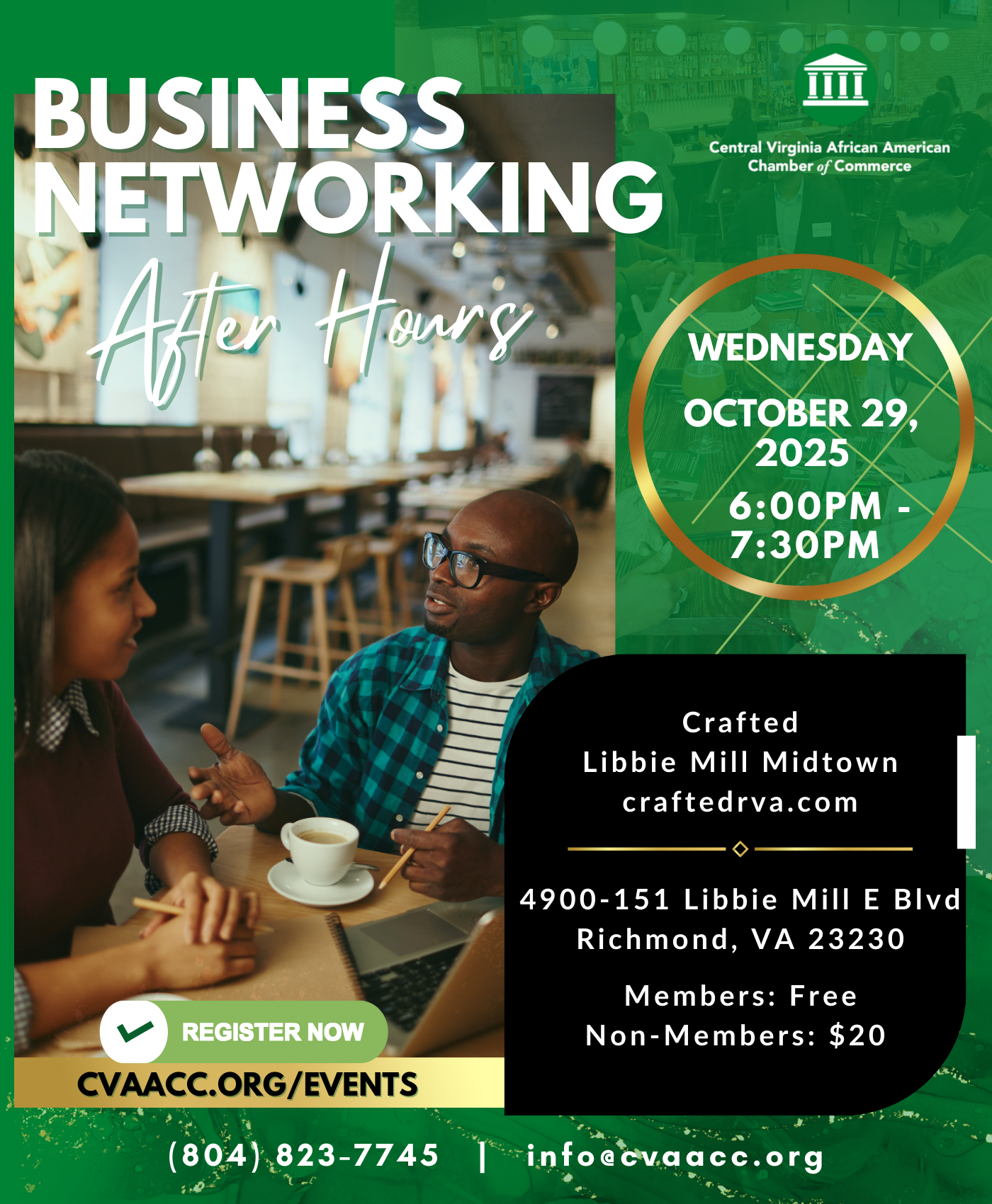 The Central Virginia African American Chamber of Commerce hosts this month's Business After Hours at Crafted in Libbie Mill Midtown, Richmond, VA. Starting at 6:00 PM, join us to meet, mingle, and mix with other business owners, professionals, and like-minded entrepreneurs.