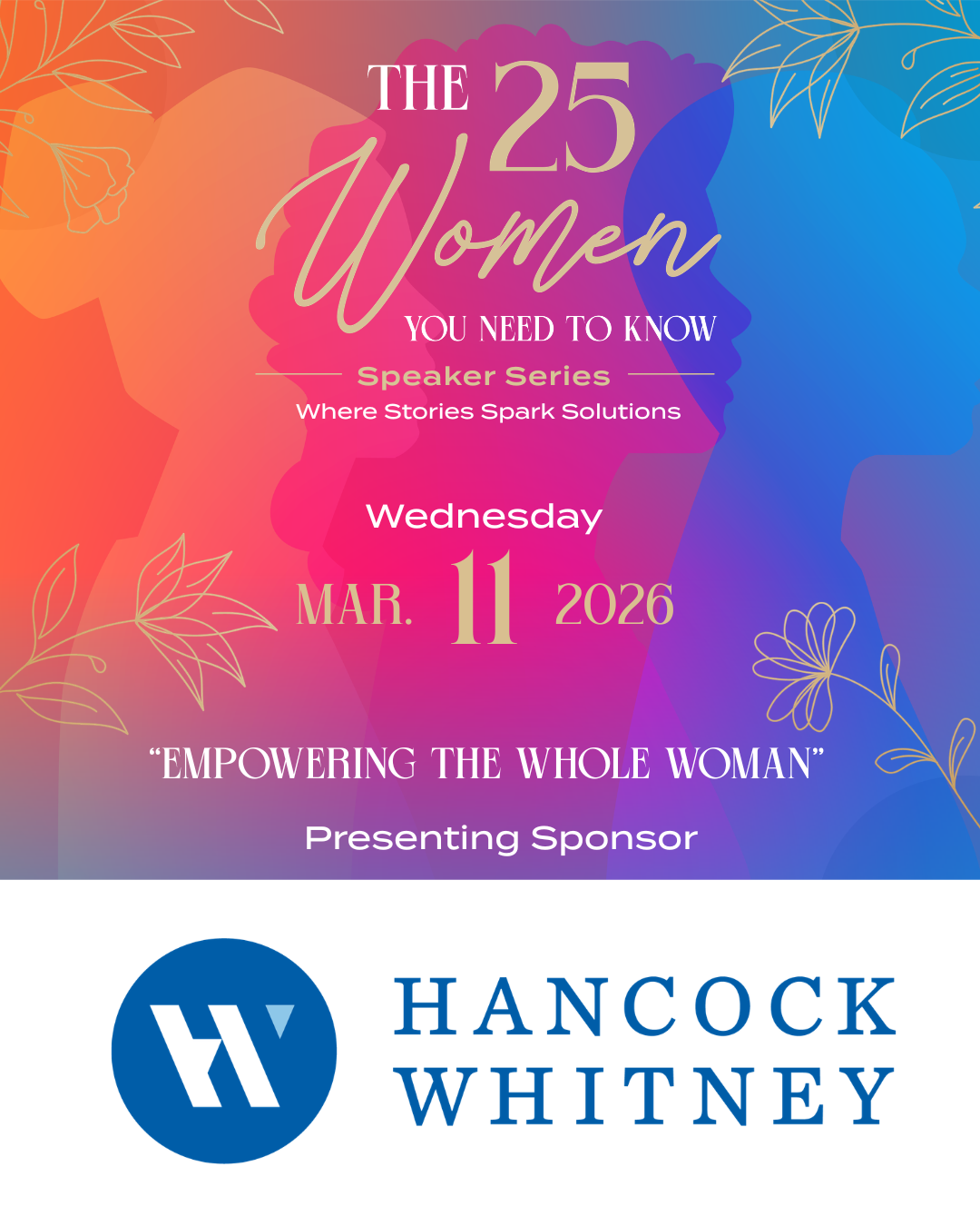 During Women’s History Month, on March 11th, we are proud to host Empowering the Whole Woman, with Hancock Whitney Bank as our presenting sponsor.