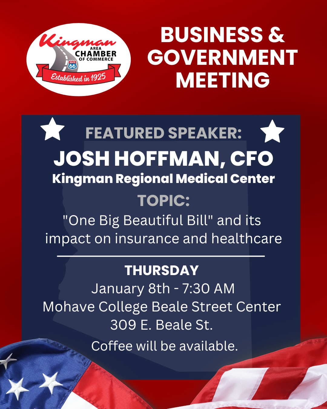 Join us for our Business & Government Meeting on Thursday, January 8 at 7:30 AM! Featured Speaker: Josh Hoffman, CFO of Kingman Regional Medical Center Topic: “One Big Beautiful Bill” and its impact on insurance and healthcare Mohave College Beale Street Center, 309 E. Beale St. Coffee will be available.