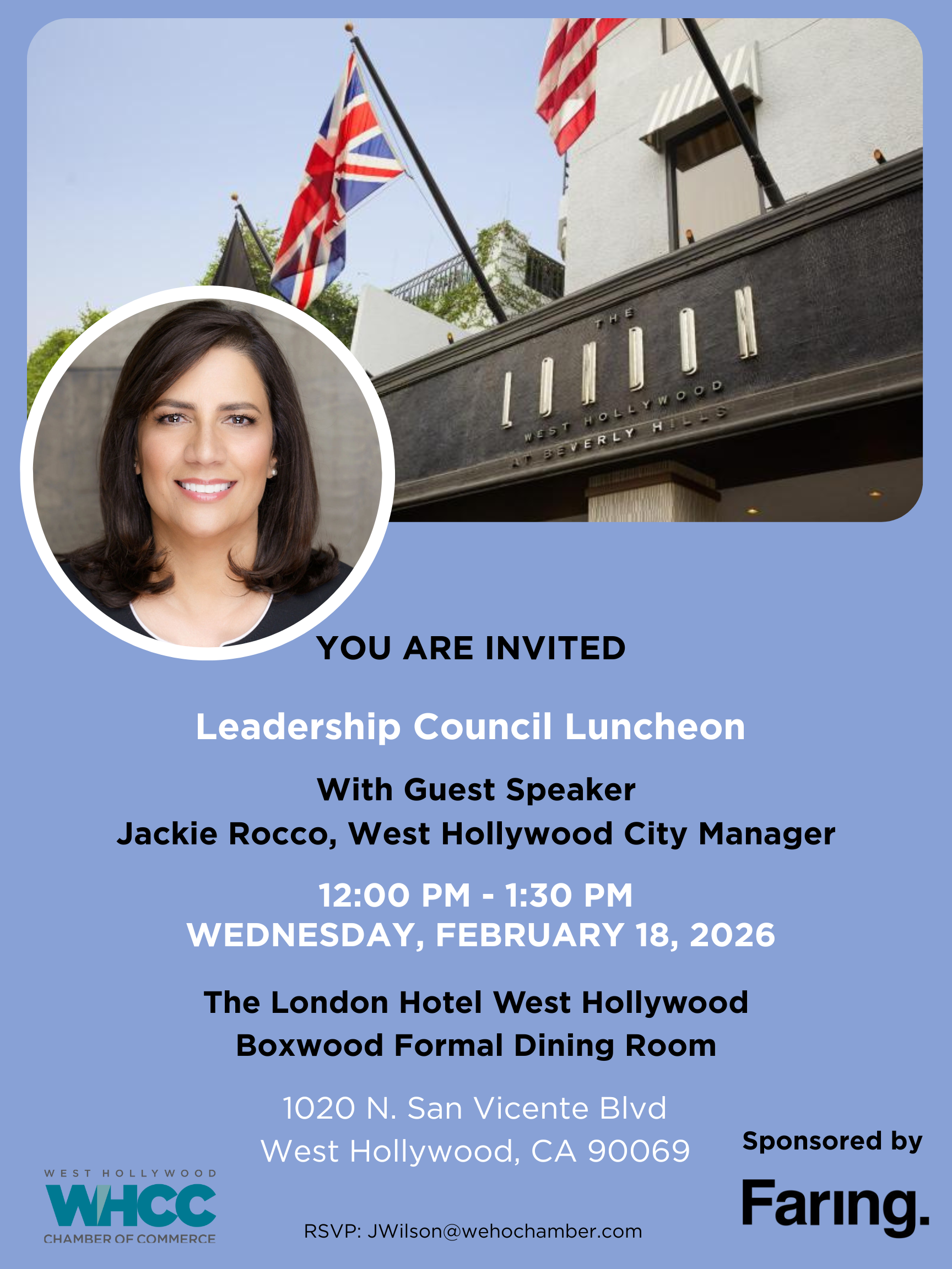 Leadership Council Events are for Chamber Members at the Leadership Council level. For more information on upgrading your membership, please email Membership Manager, Jamie Wilson, at JWilson@wehochamber.com. To learn more about all the WHCC membership packages, check out the Membership Benefits page on our website. For any other questions related to Leadership Council Luncheon events, please email admin@wehochamber.com.