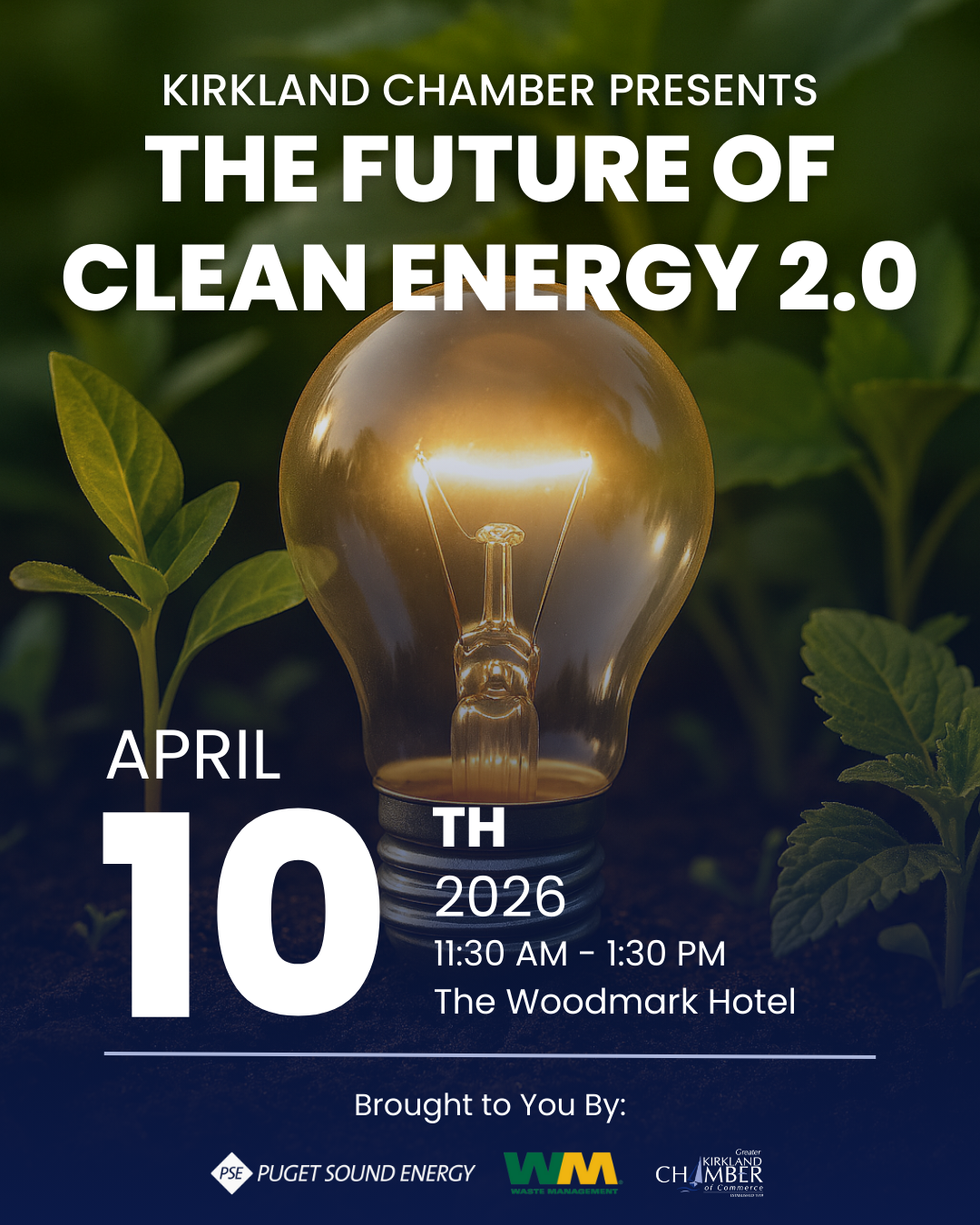Join The Kirkland Chamber of Commerce on Friday April 10, 2026 for an engaging panel discussion featuring regional clean energy leaders as we explore the technologies, strategies, and innovations shaping Washington’s energy future—from wind and solar to small modular reactors and fusion.