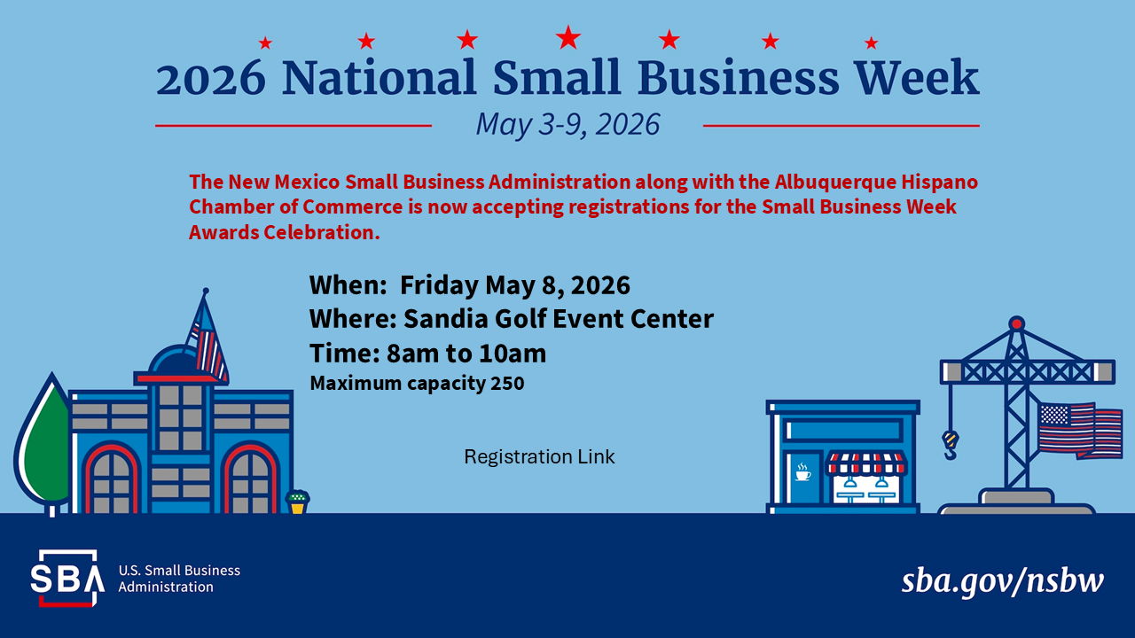 Join us for the annual SBA New Mexico Small Business Awards Breakfast on Friday, May 8th, at the Sandia Golf Club, as we honor the outstanding award winners during National Small Business Week 2026!