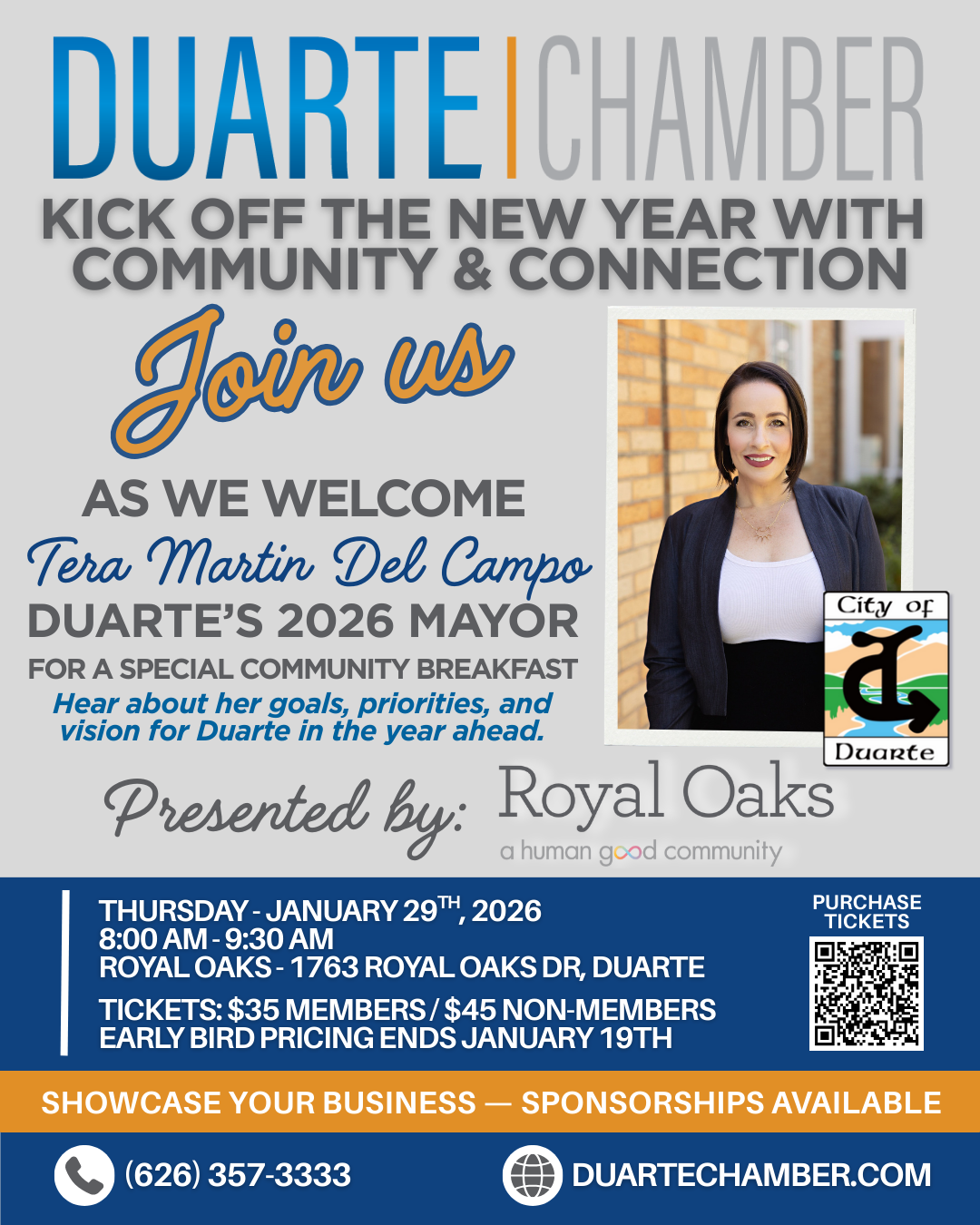Start the new year with us as we welcome Duarte’s incoming Mayor for 2026.